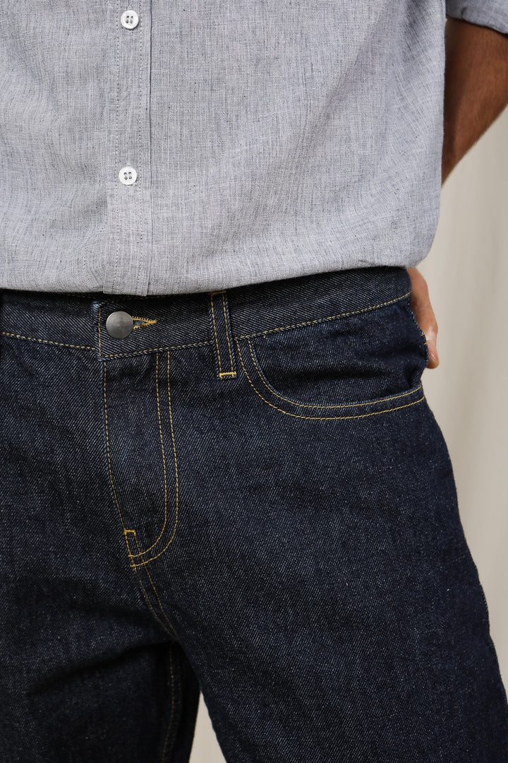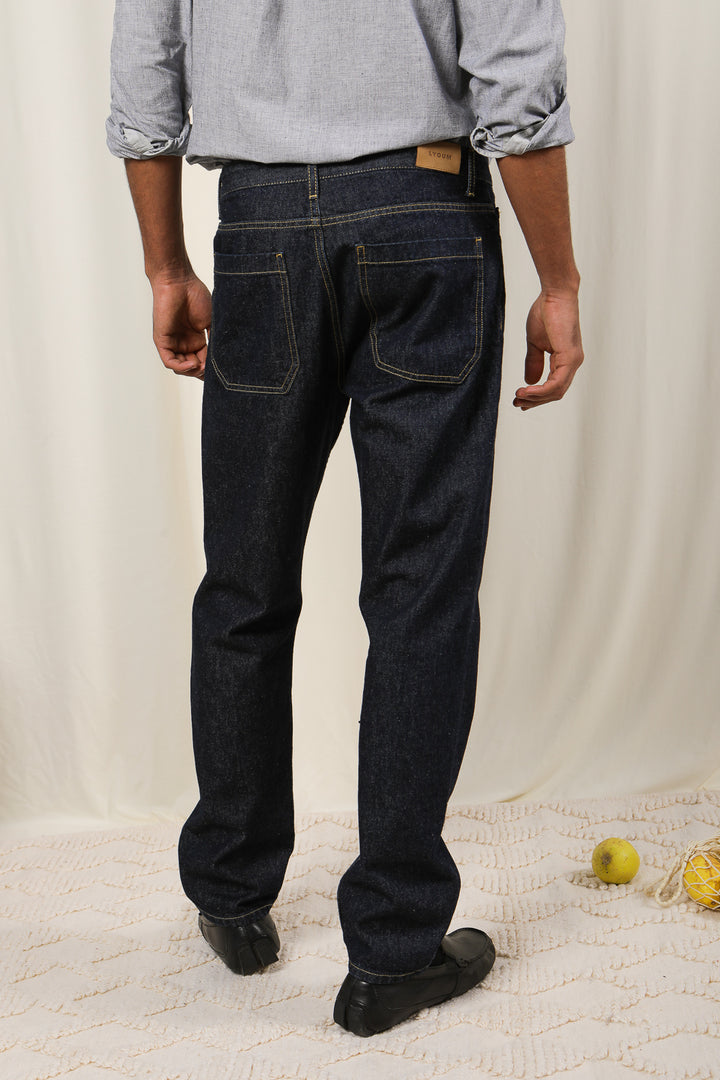 - 5 poches brut, bleu nuit, coupe droite, couture contrastée bronze et braguette zippée.