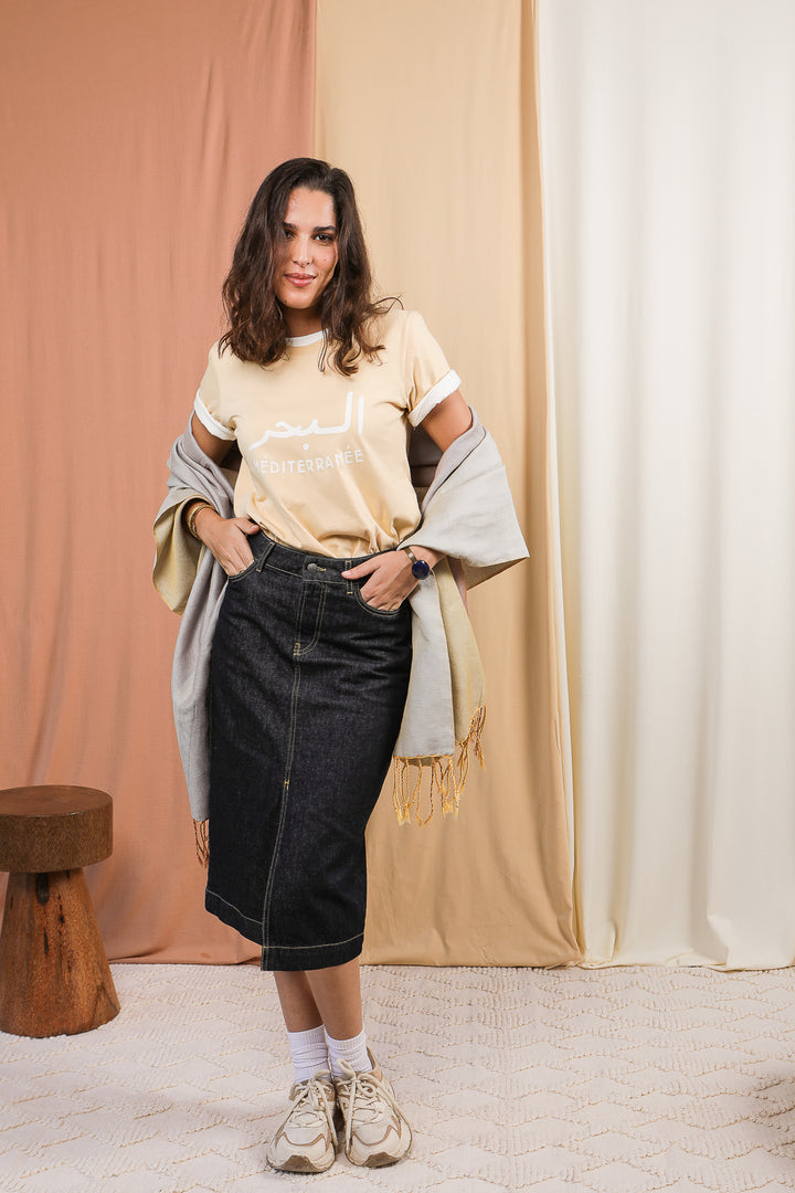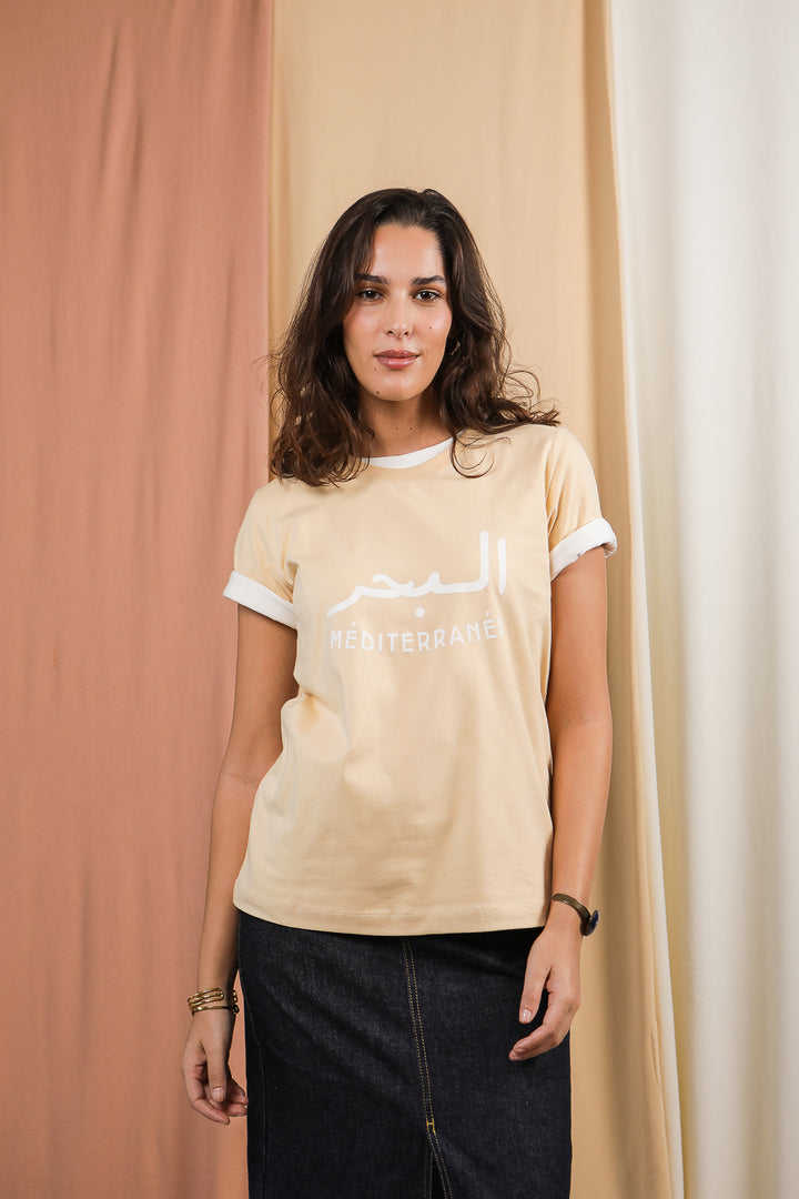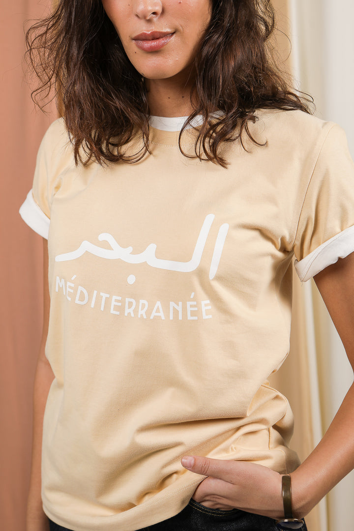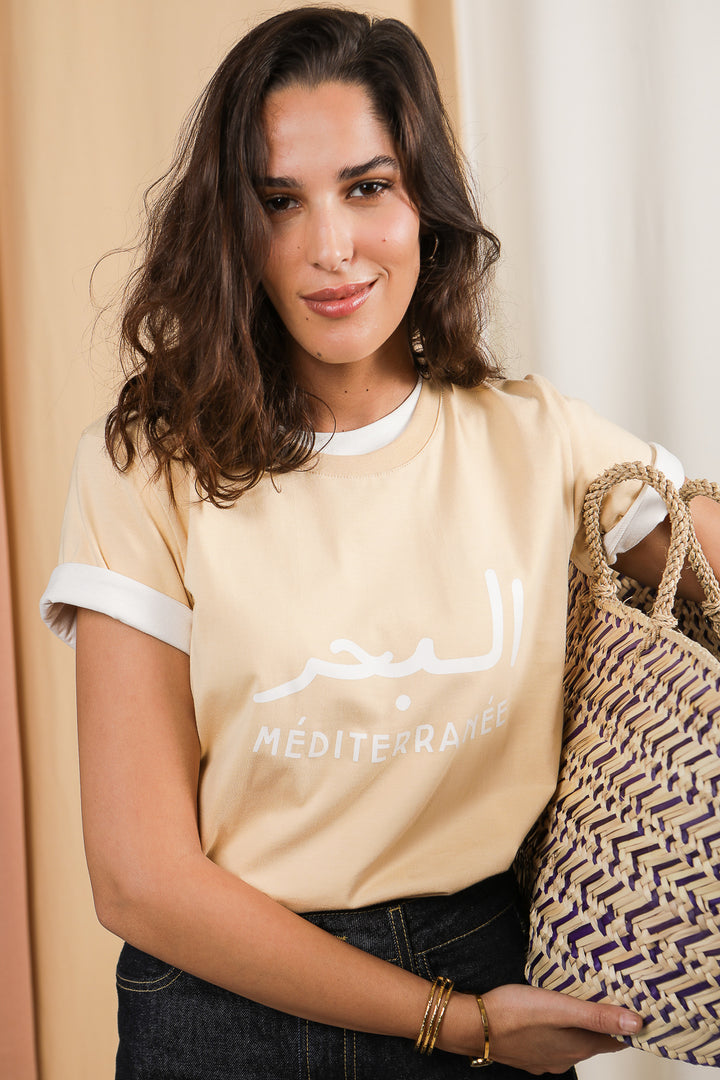 - Sérigraphie 'La Mer Méditerranée' en écru, mélange subtil d’arabe et de français sur le devant.